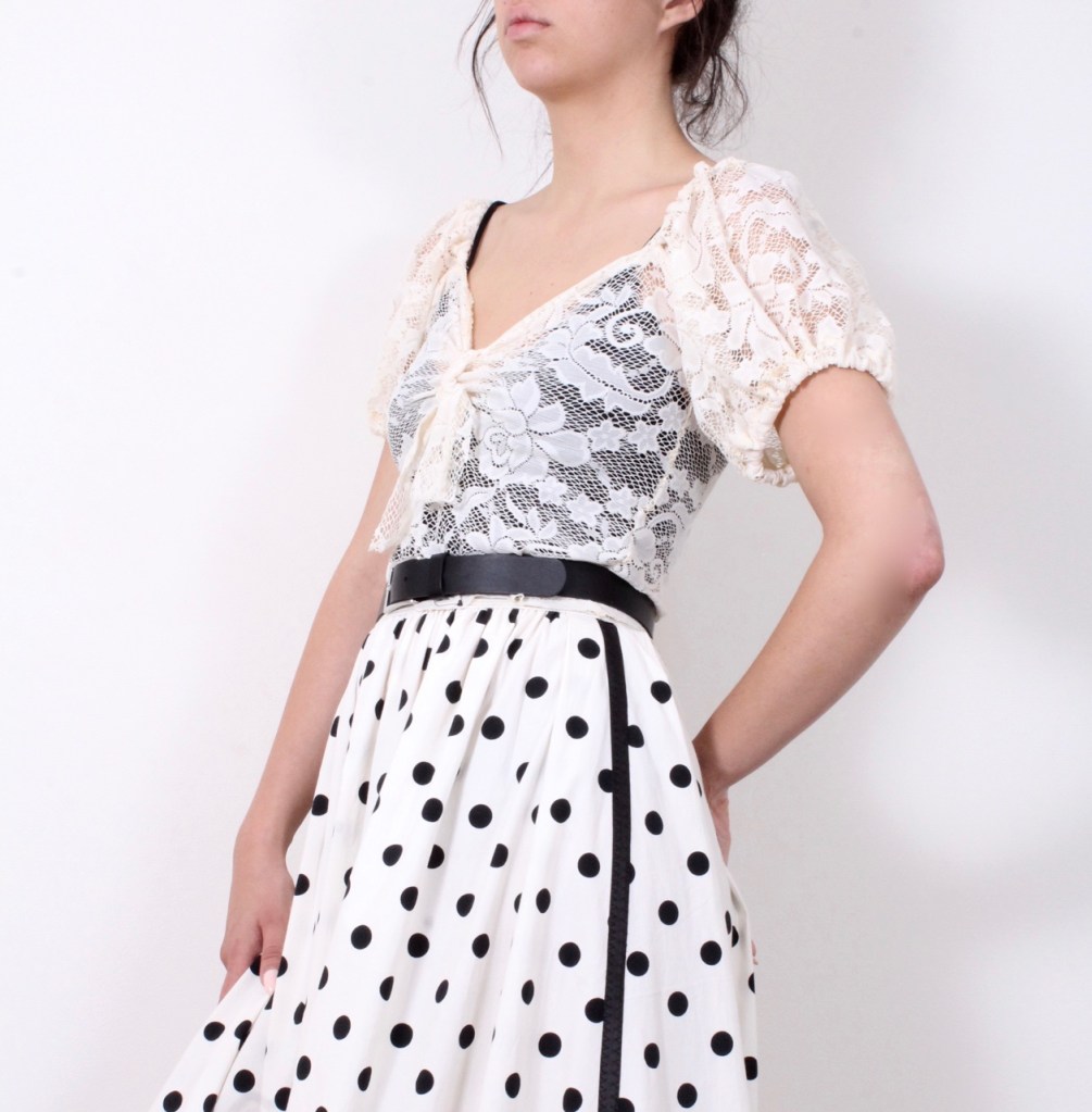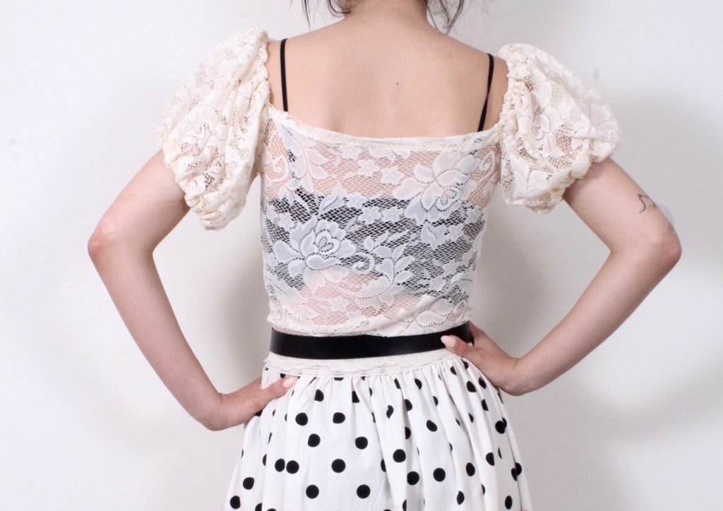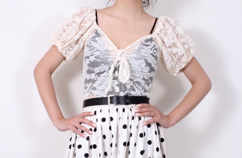 Нежна и романтична. Модел от дантела с деколте и богати буфан ръкави. Блузате е без подплата.