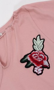 Свежа и цветна. Модел с ниска талия с лек набор и скрит ластик, 3/4 ръкави, два странични джоба и акцентираща бродерия разположена в горната лява част на роклята.