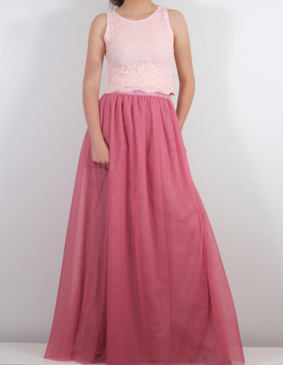 Дълга тюлена пола в ябълково розово и дантелена блуза в пудрен цвят