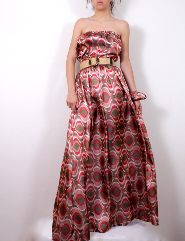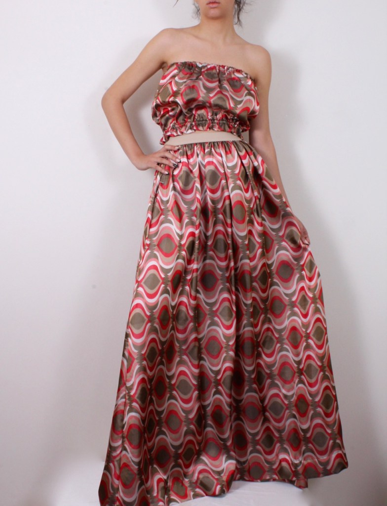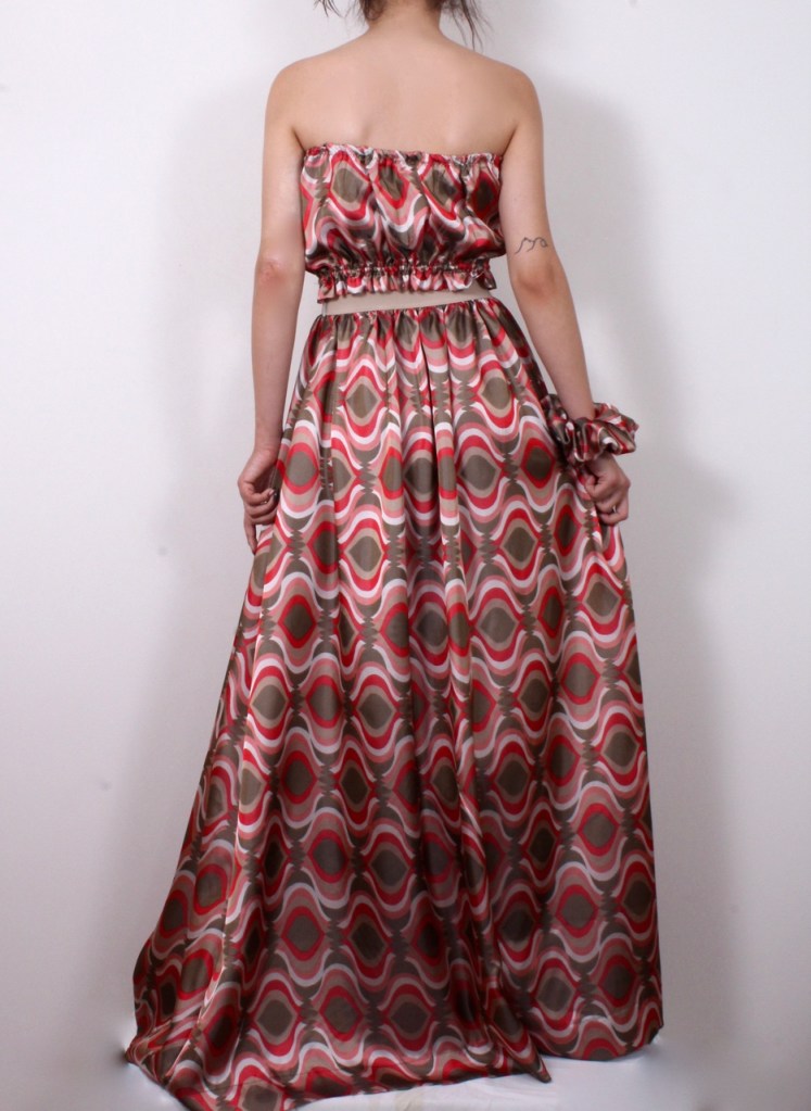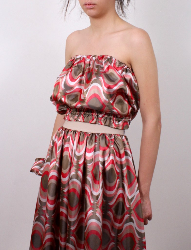 Романтична комбинация от къс топ с ластик и дълга пола с ластик на талията, два странични джоба и допълващ колан от основния плат.