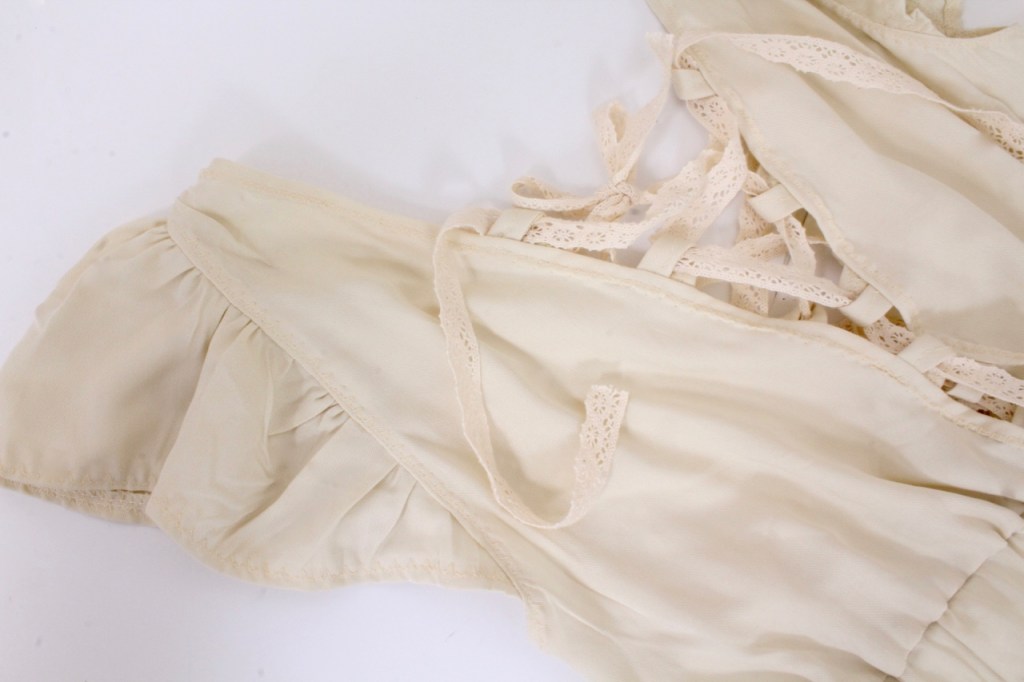 Нежна и романтична във ваканционен стил. Модел с висока талия с набор и ластик, V-образно деколте и гръб с акцентиращи дантелени връзки, къси раздвижени ръкави, два странични джоба и допълващ колан от основния плат / няма го на снимките, но е включен към роклята/.