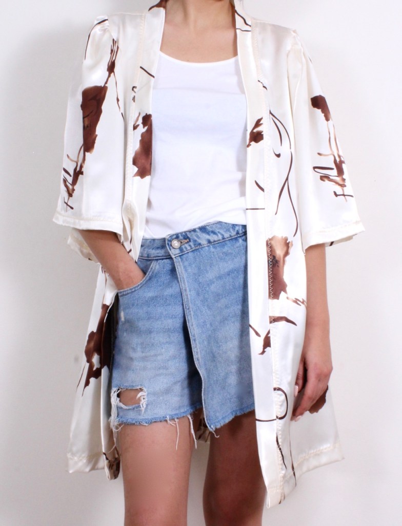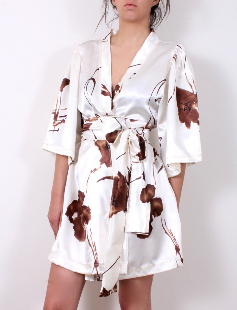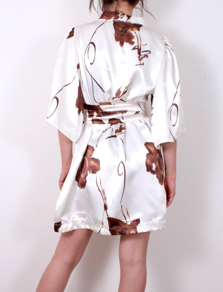 Класическо сатенено кимоно в нежен десен. Свободен отворен модел с 3/4 широки буфан ръкави и допълващ колан от плата. Походящо и за плаж.