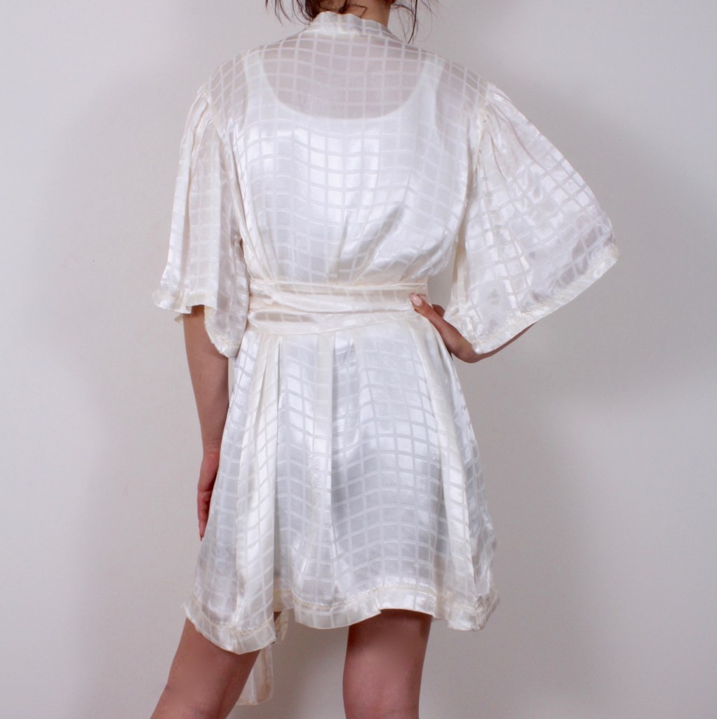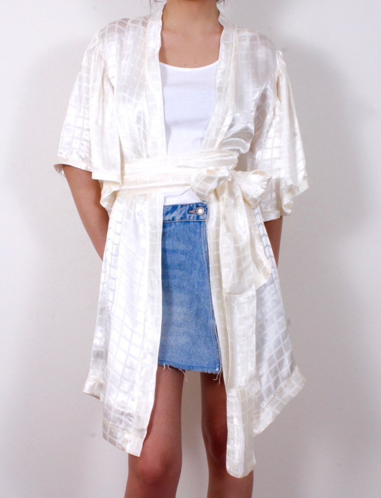Класическо кимоно в нежен летен цвят. Свободен отворен модел с паднали 3/4 широки буфан ръкави и допълващ колан от плата. Походящо и за плаж.