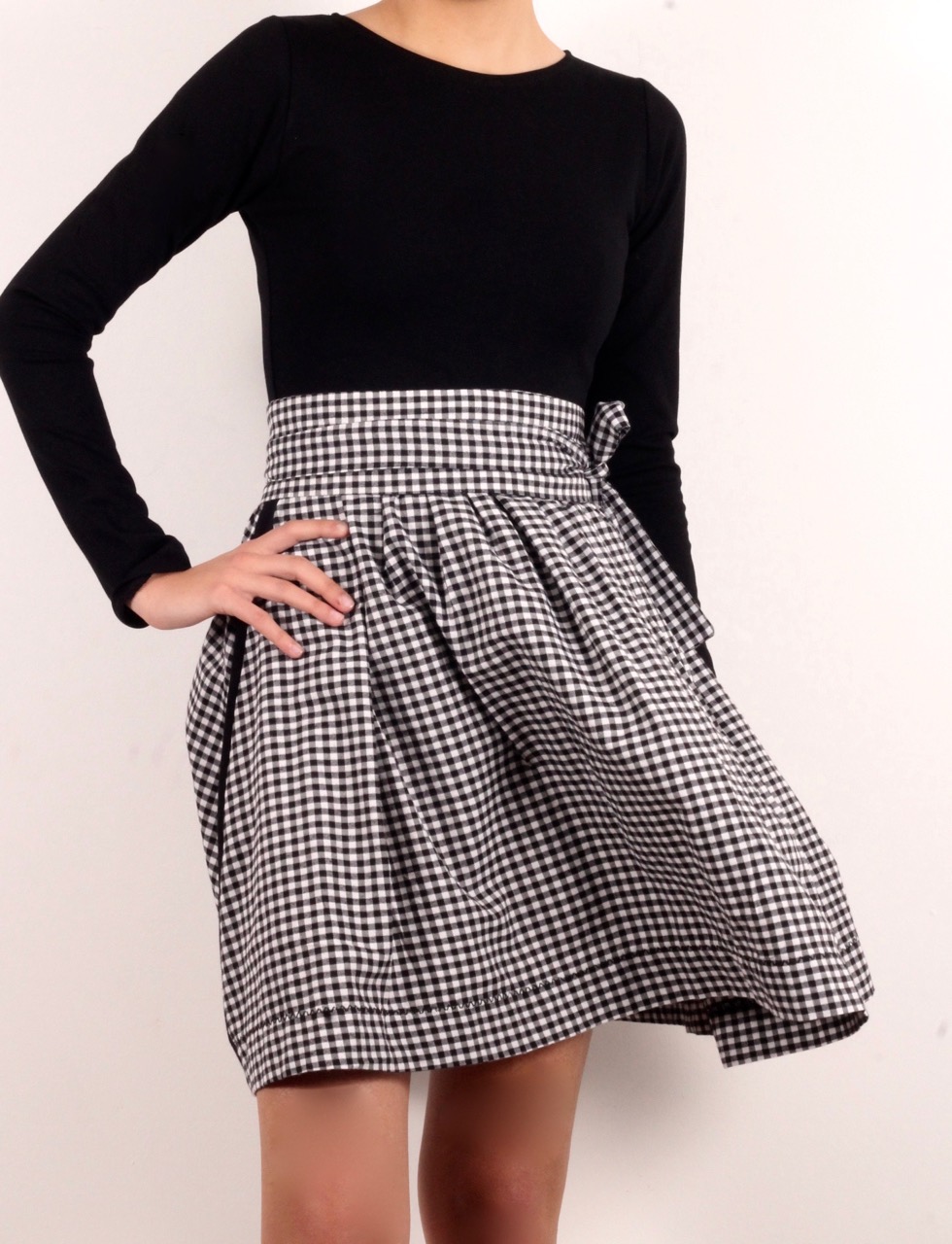 Рокля в черно-бяло каре с черен кант