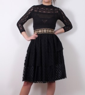 Тюлена рокля в черно от комбинирани материи и волани