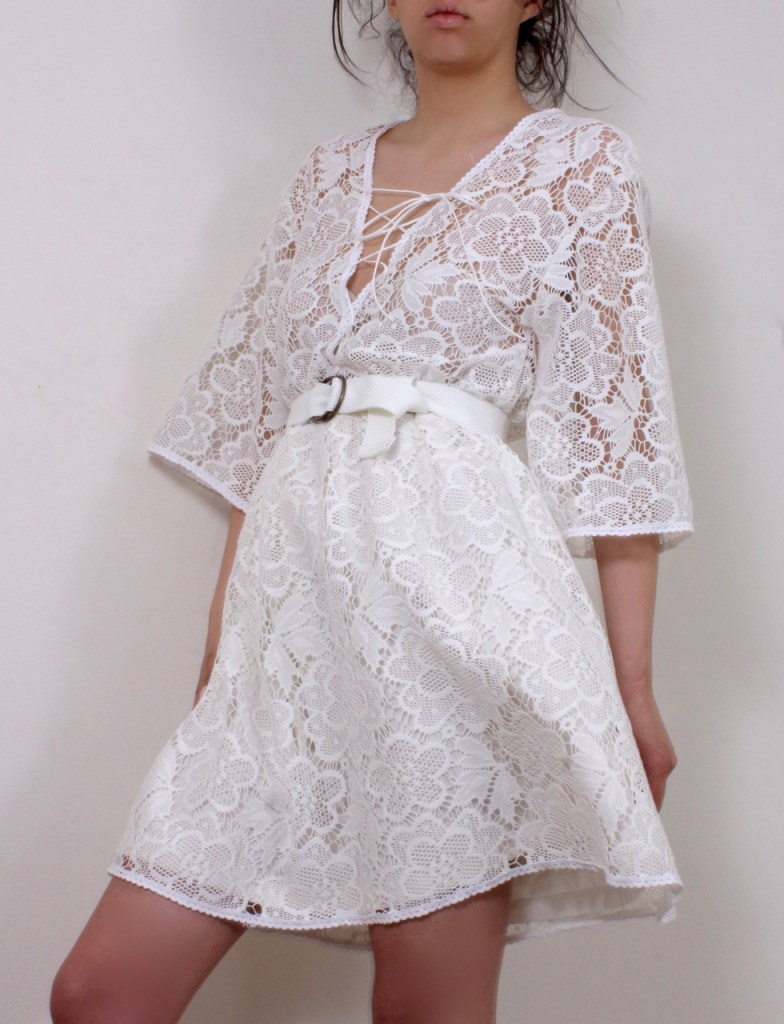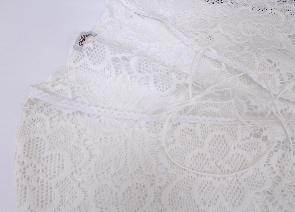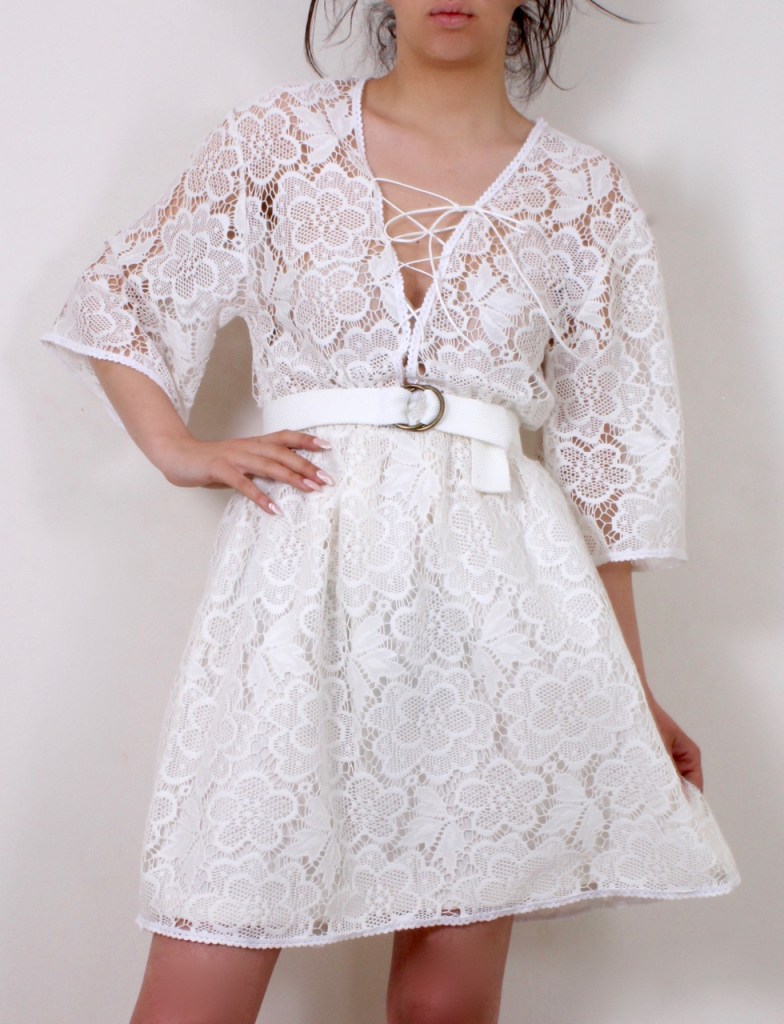 Раздвижена и романтична. Модел от нежна дантела в бохо стил с висока талия с ластик, свободни паднали 3/4 ръкави с асиметрична дължина, V- образно деколте с акцентираща дантела и допълващ колан с халки. Долната част е подплатена с фин памук, горната е без подплата.