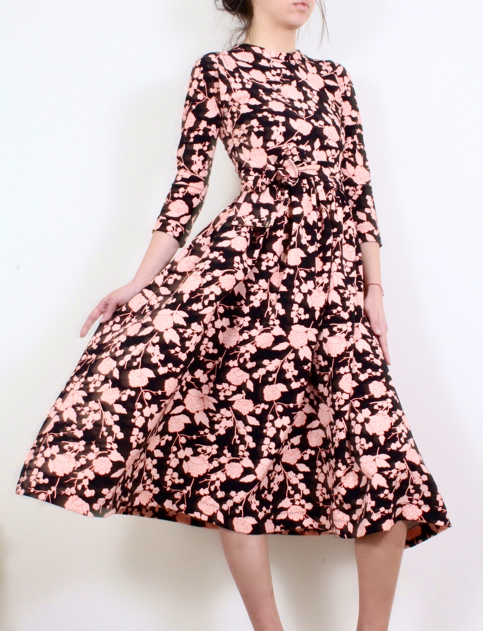 Миди рокля в десен на нежни розови цветя и черен фон