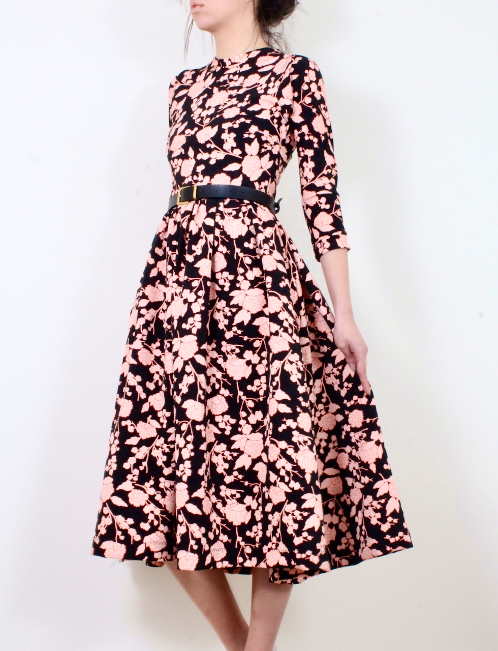 Миди рокля в десен на нежни розови цветя и черен фон