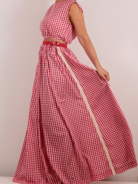 Дълга пола и къса блуза в червено-бяло каре и бежов кант