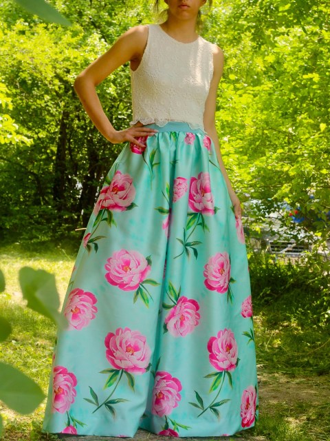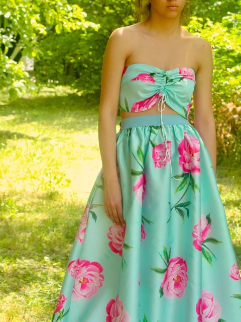 Сатенен сет от дълга пола и къс топ в ментовозелен цвят и бродерии в бежово