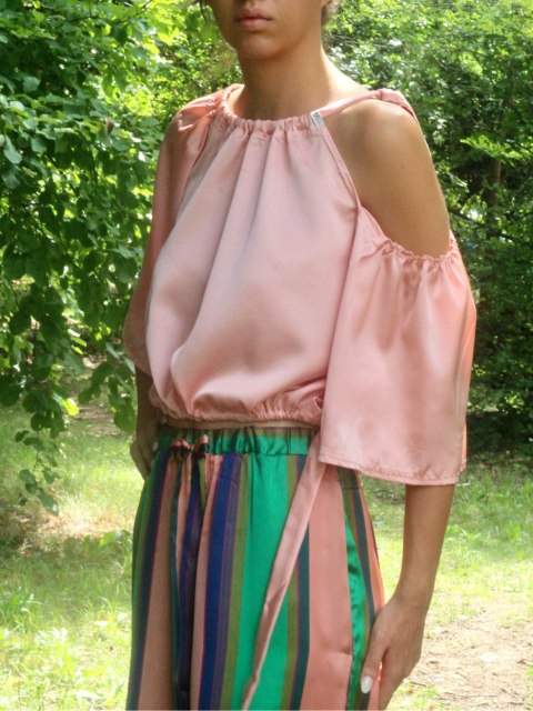 Сатенен сет от широк панталон в разноцветено райе и къса блуза в нежен цвят