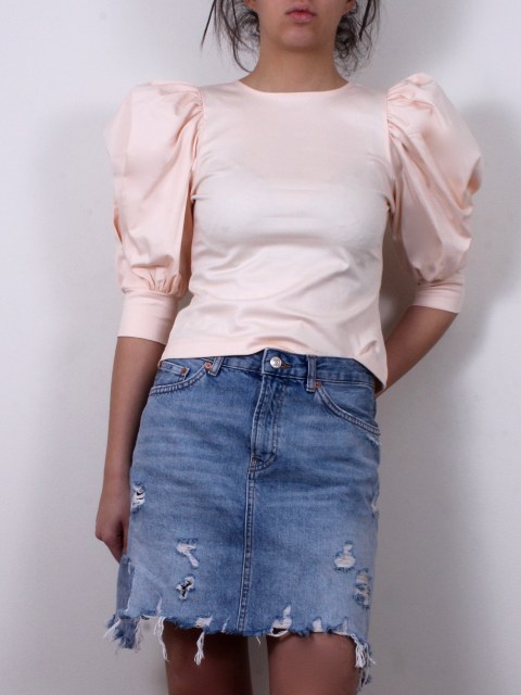 Блуза от фино плетиво и буфан ръкави от органза в сив меланж