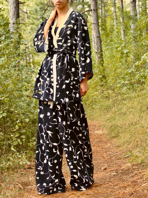 Сет от кимоно и панталон в десен на малки бежови цветя и черен фон