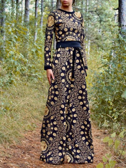 Сет от късо кимоно и широк панталон в пясъчно-златист десен