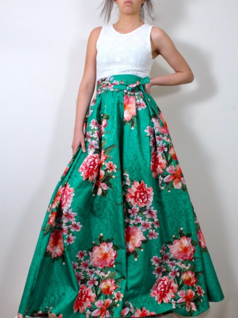 Сет от две части дълга пола и топ в ягодов десен и бял фон