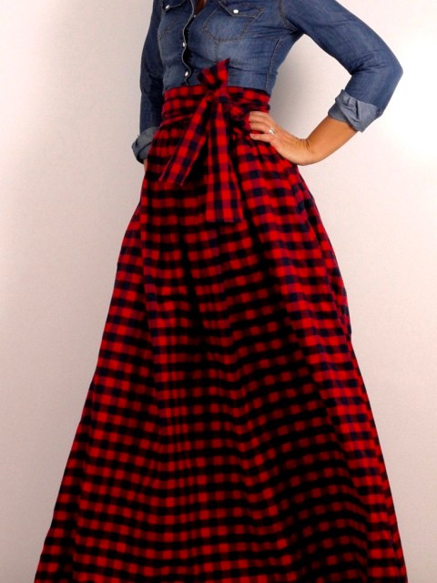 Дълга бархетна пола в едро червено каре