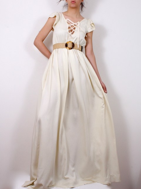 Дълга рокля във ванилов цвят с V-бразно деколте и гръб