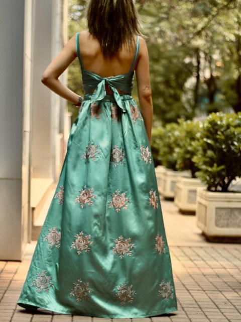 Дълга сатенена рокля с бродерии в ментово зелен цвят