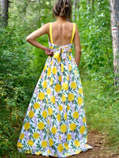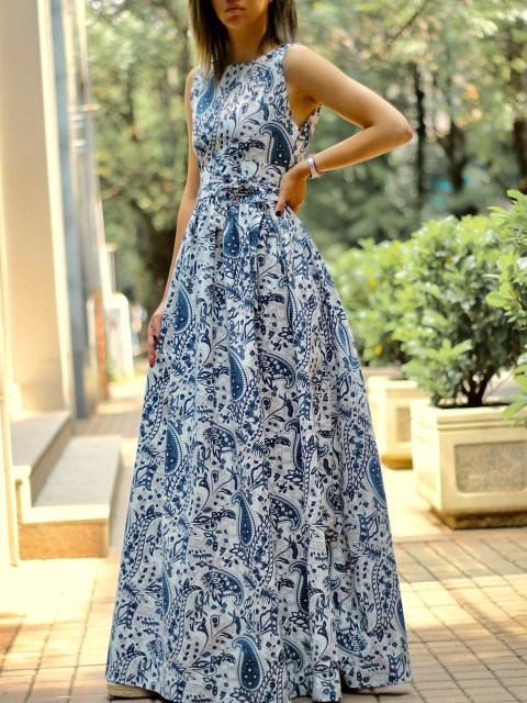 Дълга рокля в синьо-бял принт и изрязан гръб