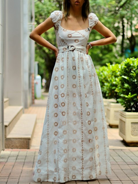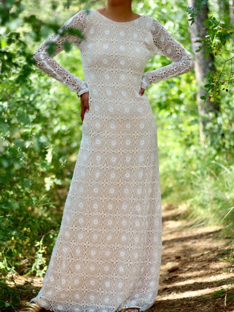 Дълга дантелена рокля с изрязан гръб в бял цвят