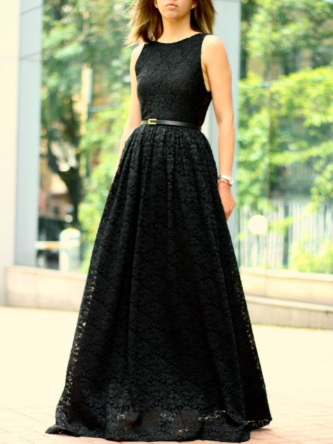 Дълга дантелена рокля в черен цвят с изрязан гръб