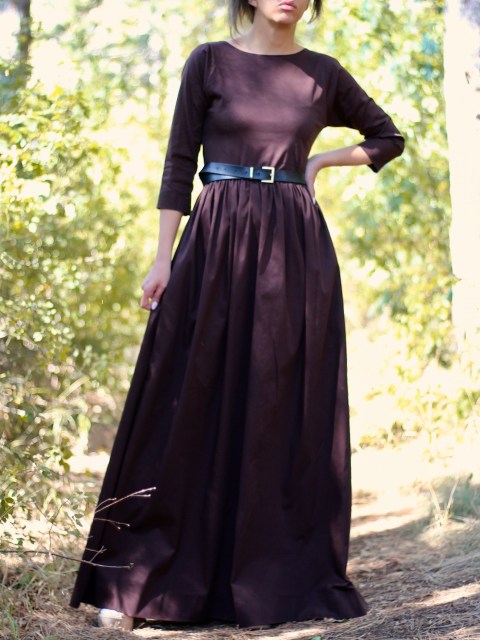 Дълга рокля с асиметричен гръб в тъмнокафяв цвят