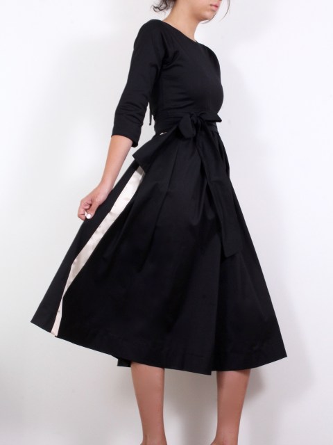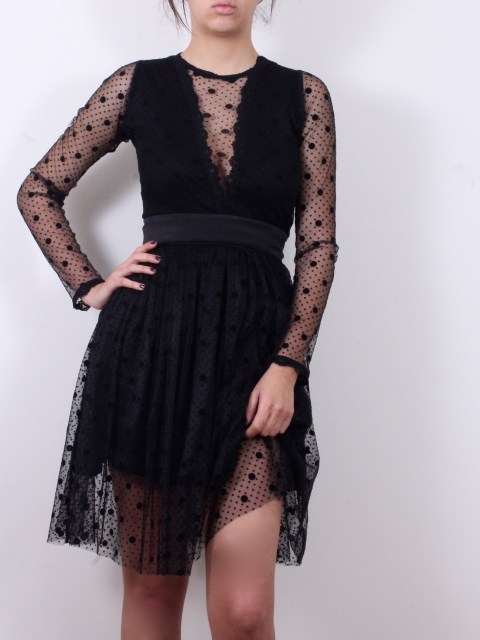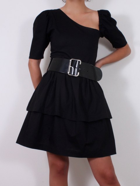 Къса рокля в черно с волани и асиметрично деколте и буфан ръкави