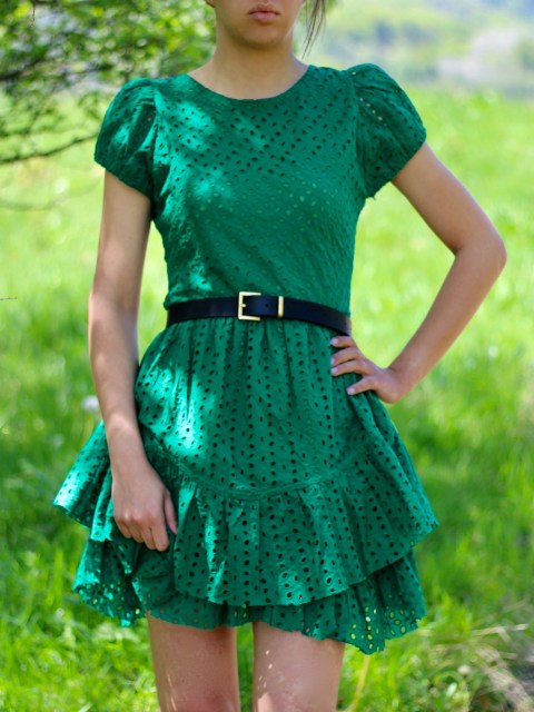 Промоция: Къса рокля с волани в памучна рязана дантела в зелен цвят и акцентиращ колан