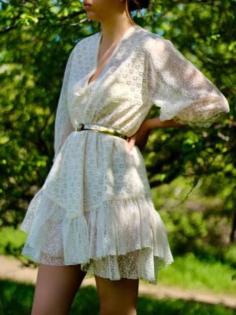 Къса рокля с V-образно деколте с акценти дантела и шевица