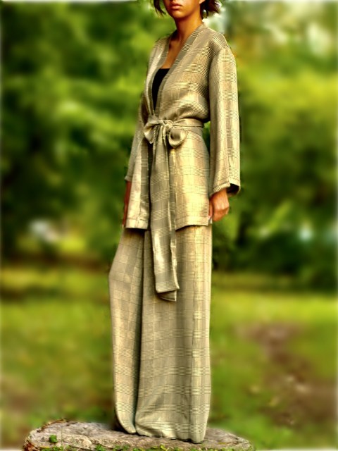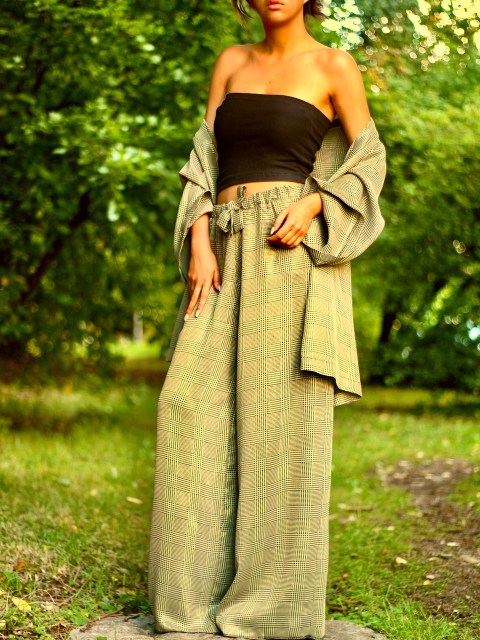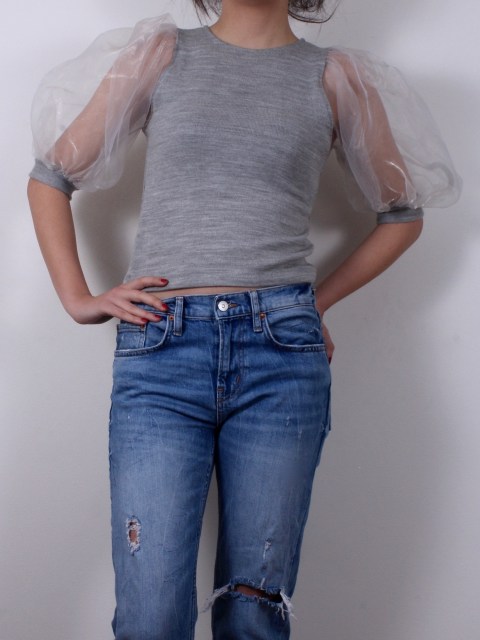 Блуза от фино плетиво и буфан ръкави от органза в сив меланж