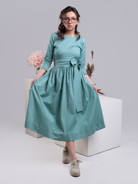 Миди рокля от памучна материя с изрязан гръб в ментовозелен цвят
