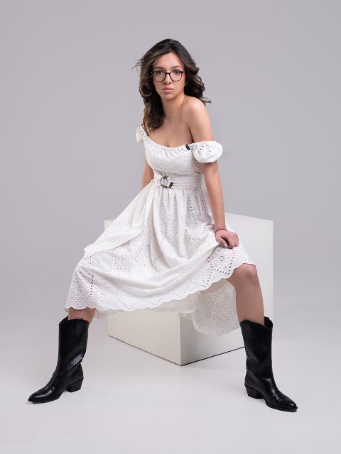 Миди рокля от рязана памучна дантела с деколте в бял цвят