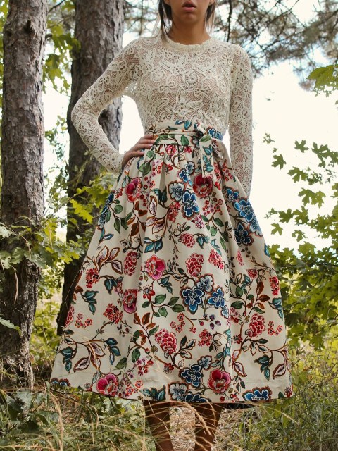 Асиметрична миди рокля в десен на пъстри цветя и светъл фон
