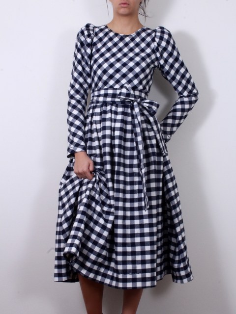 Бархетна рокля в тъмносиньо каре с буфан ръкави и миди дължина