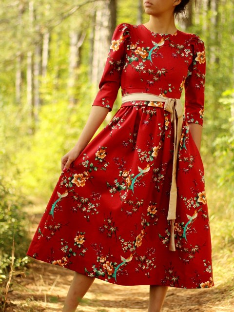 Рокля в червено с къси буфан ръкави