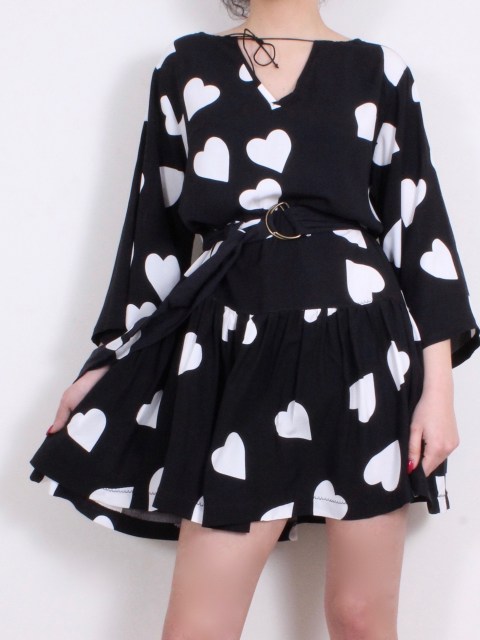 Къса свободна рокля в бохо стил и волан в черно-бял принт на сърца