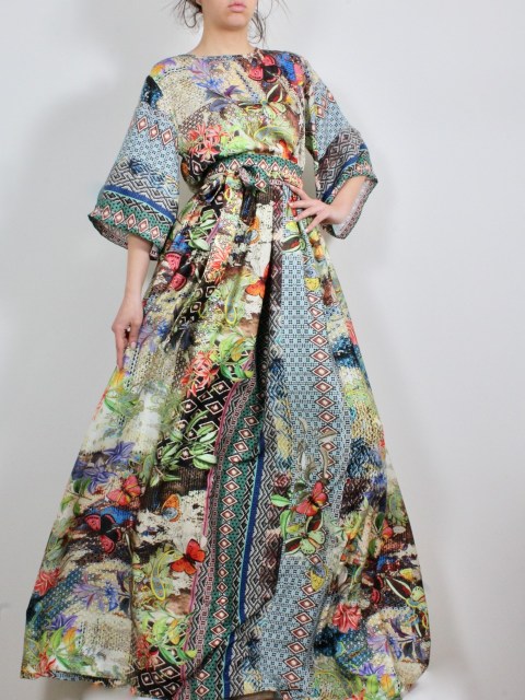 Дълга сатенена рокля с изрязан гръб и разноцветен принт