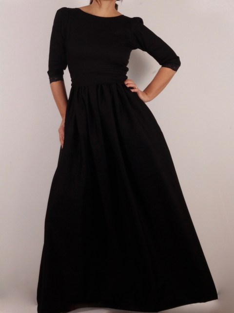 Дълга рокля в класическо черно с изрязан гръб и 3/4 ръкав