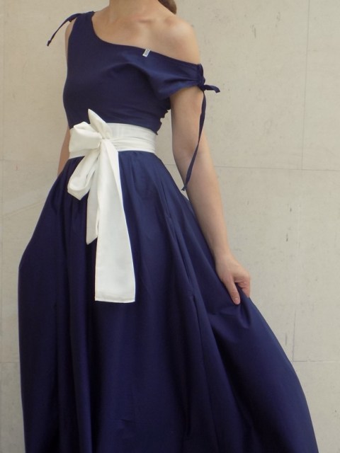 Дълга рокля в тъмносиньо с паднало рамо и два колана