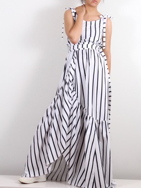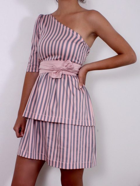 Къса рокля с аиметрично рамо и буфан ръкав в двуцветно райе в пастелни тонове