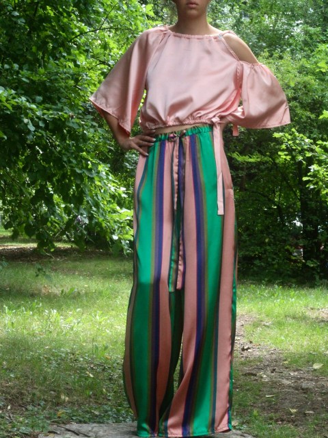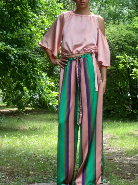 Сатенен сет от широк панталон в разноцветено райе и къса блуза в нежен цвят