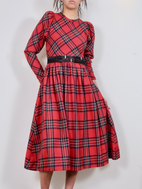 Бархетна рокля в разноцветно каре на червен фон