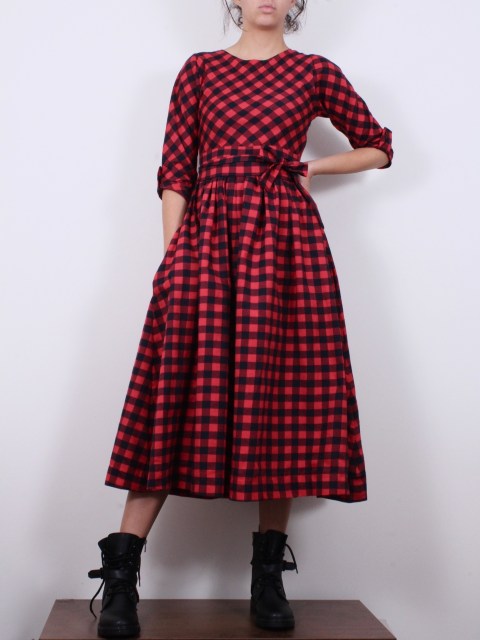 Бархетна рокля в червено каре и миди дължина