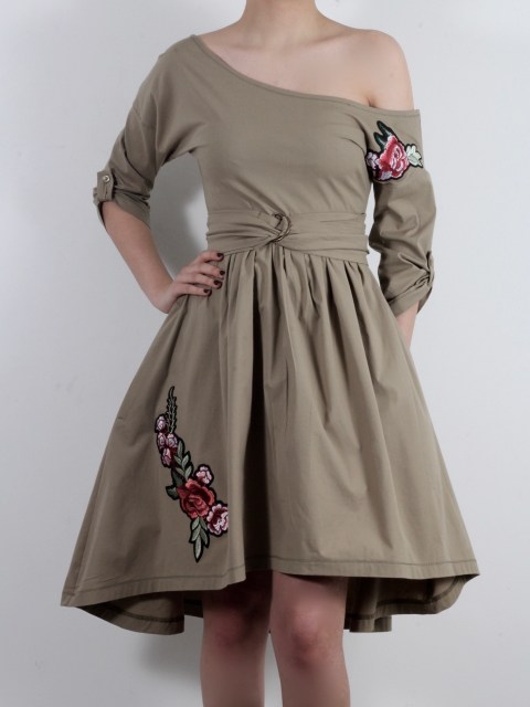 Асиметрична рокля в милитъри стил с паднало рамо и бродерии