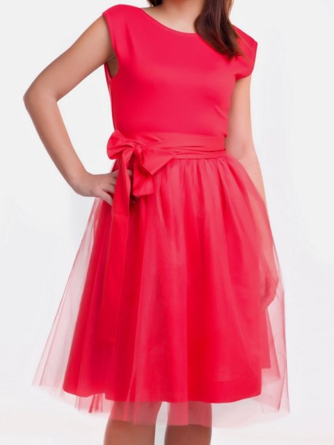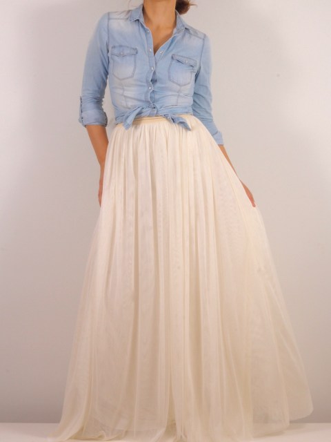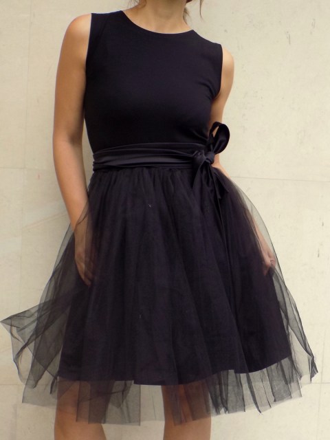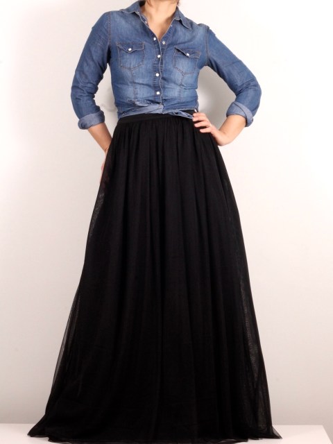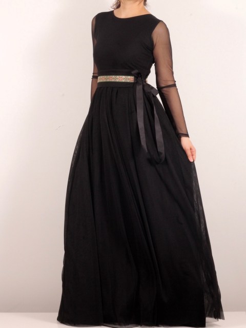 Дълга тюлена рокля в черно с акцент колан с шевица