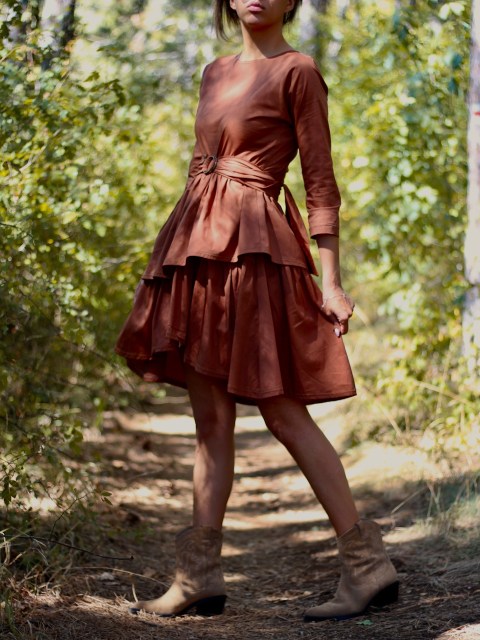 Дълга сатенена рокля с изрязан гръб в кафяв цвят