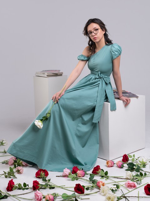 Дълга рокля с асиметрично делколте в ментовозелен цвят