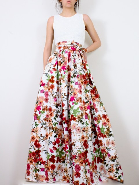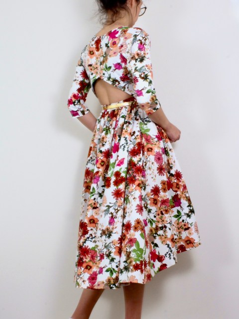Дълга рокля с изрязан гръб в десен на пъстри цветя и светъл фон