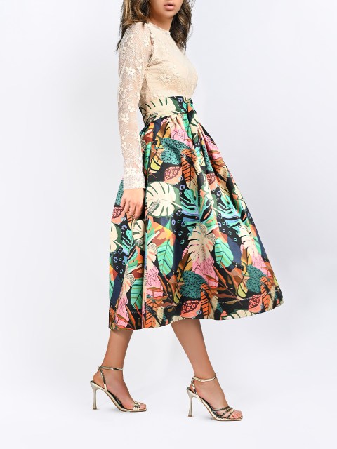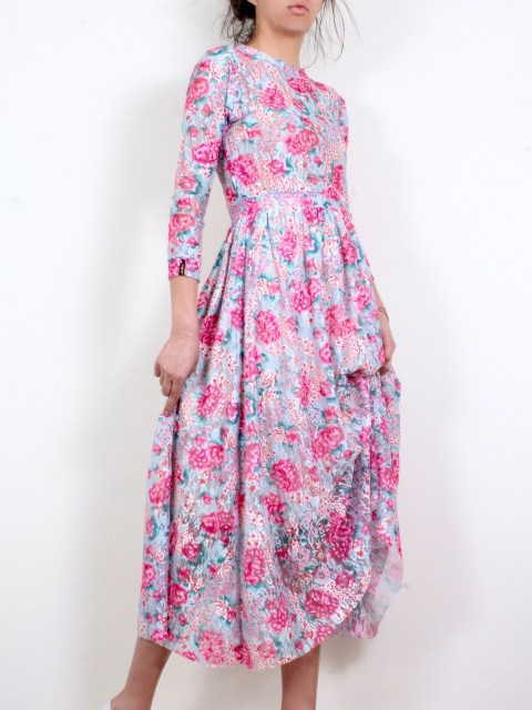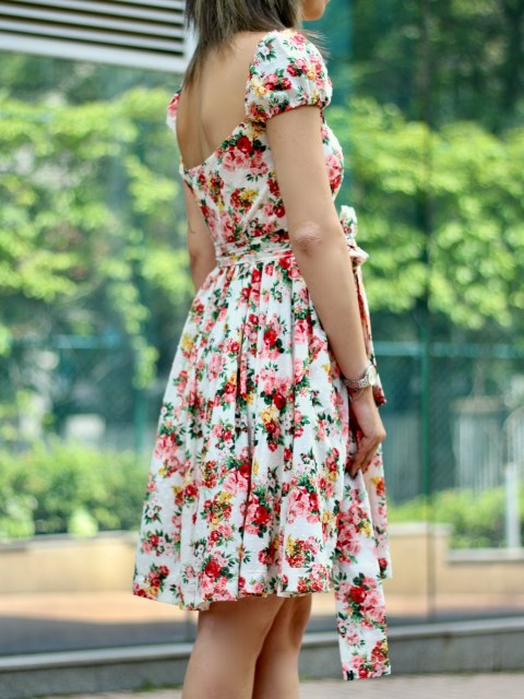 Асиметрична миди рокля в десен на пъстри цветя и светъл фон