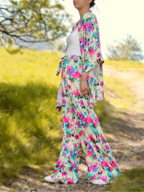 СЕТ ОТ ДВЕ ЧАСТИ КЪСО КИМОНО И ШИРОК ПАНТАЛОН В флорален десен